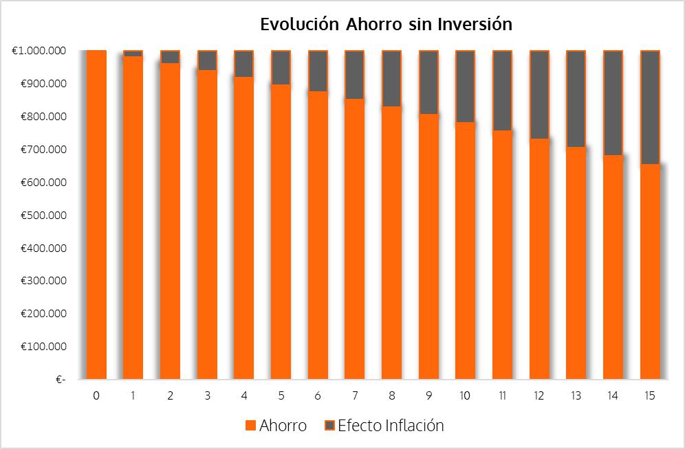 Recuperamos un gráfico, que hemos utilizado ya en alguna ocasión, para ilustrar el efecto de la inflación en nuestros ahorros si no le ponemos remedio.