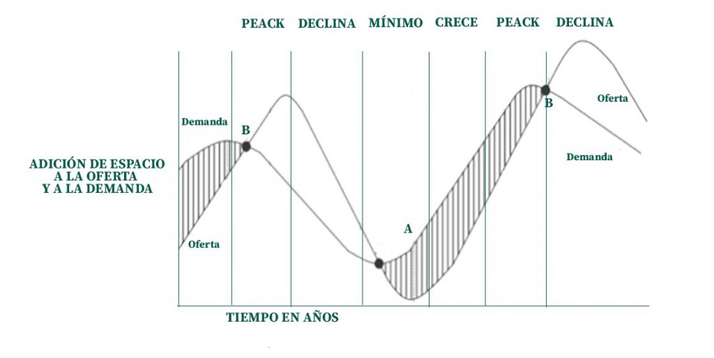 - Una oferta/demanda Inelástica: Los ciclos se mueven según la capacidad del mercado por aportar suficiente oferta para satisfacer la demanda. Pero esta capacidad no es inmediata debido a los tiempos de ejecución de los inmuebles. (Esto provoca que la oferta siempre vaya por detrás de la demanda).
