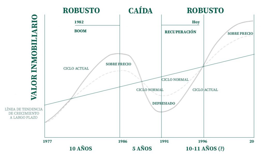 Este ciclo se caracteriza por tener una estrecha relación con los ciclos económicos ya que están ligados a variables como la especulación del suelo, las rentas, las tasas de interés, etc. Pero también por factores a nivel local, nacional e incluso a nivel internacional que provocan que no sea tan sencillo saber en qué fase se encuentra un mercado determinado o predecir su tendencia.