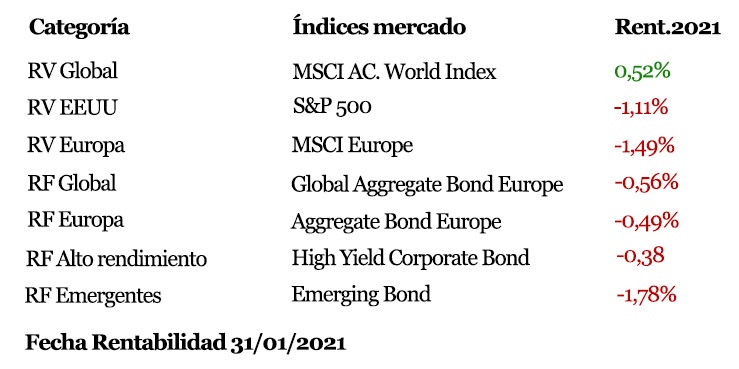 Ponemos fin a un mes de enero algo más movido de lo que podíamos esperar en los mercados financieros. El año empezaba siguiendo la tendencia alcista para las bolsas heredada de 2020, con aquellas empresas y sectores más dañadas recuperando a marchas forzadas frente al resto. En la parte del crédito, los diferenciales de tipos de interés continuaron acercándose a valores mínimos, situación similar a la de hace un año pero esta vez con algo más de temor por parte de los inversores ante un posible estrés debido al mayor nivel de endeudamiento alcanzado en líneas generales.