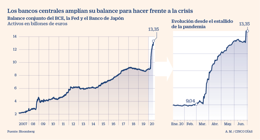 El gráfico publicado por cincodías.elpais.com refleja los balances de bancos centrales y su expansión sin precedentes durante la pandemia.