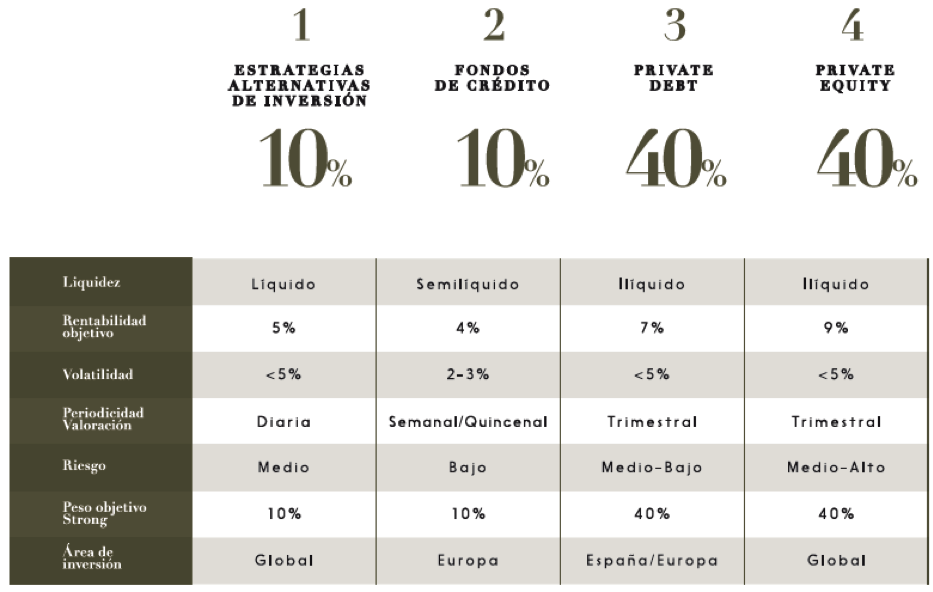 Para conseguir sus objetivos, Strong invierte en algunos activos de carácter ilíquido o semilíquido, lo que implica un horizonte temporal de la inversión definido e inflexible.