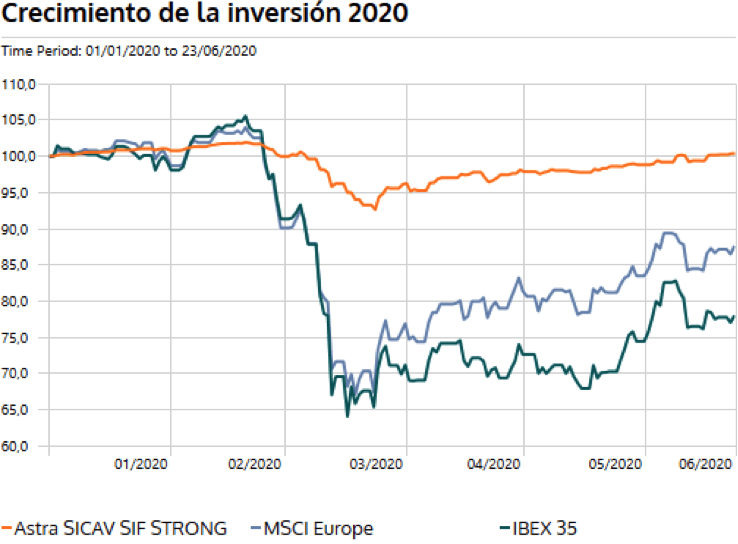 La rentabilidad del fondo en 2020 ha sido un éxito en el contexto vivido de elevada volatilidad y caídas generalizadas en los mercados. A día 23.06.20, la rentabilidad en el año 2020 era positiva de un +0.37%.